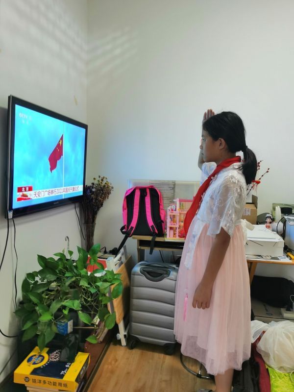 五年级(2)班学生汤珞琛是学校国旗班的升旗手,今天在家和爸爸一起参加了升旗仪式。平时老师说的要整理仪容仪表,身体站正,注视国旗,用饱满的热情唱国歌,她都一丝不苟地教给了爸爸。父女俩一起参加升旗仪式,感觉心里暖暖的:“有国才有家,愿我们的日子和和美美,祥和安宁!”