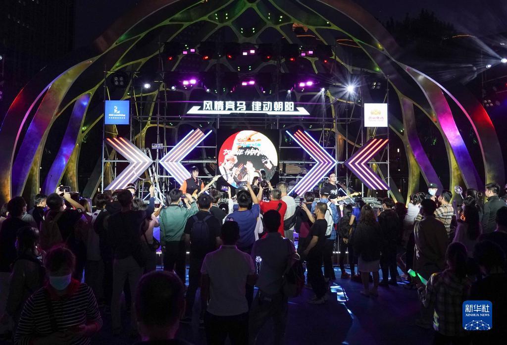 10月1日晚,人们在北京市朝阳区燕莎码头观看音乐演出。新华社记者 陈钟昊 摄