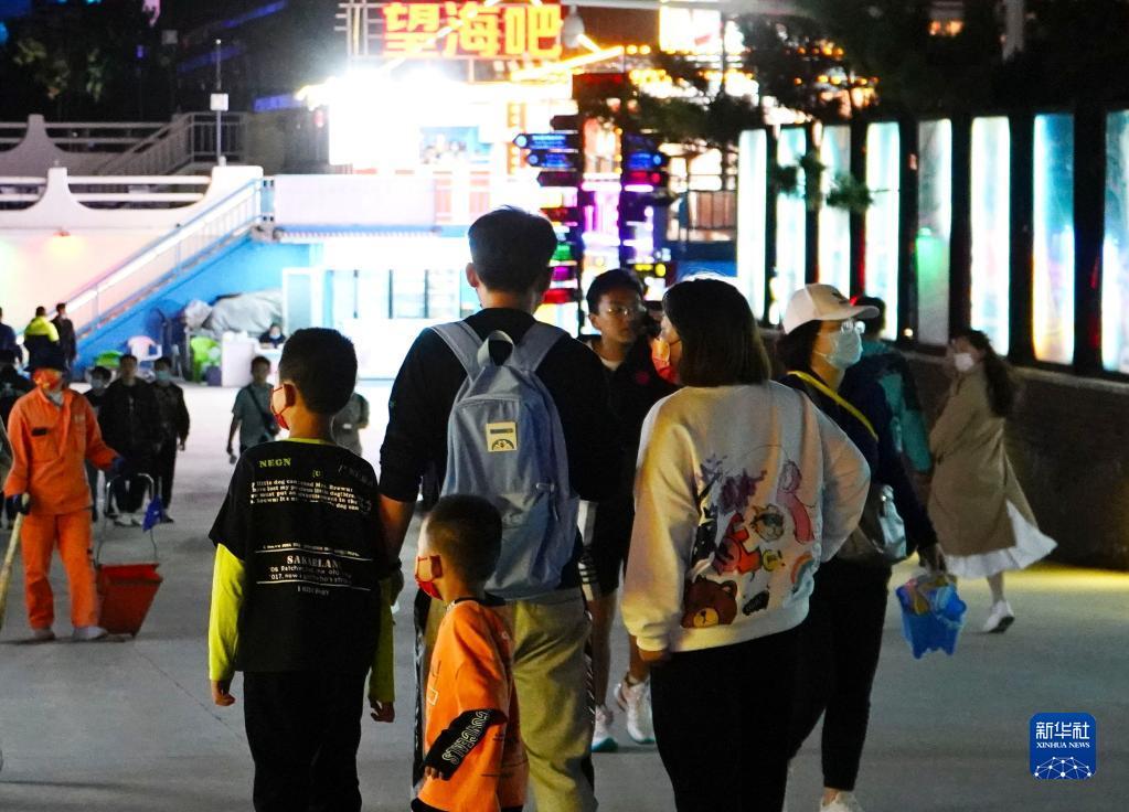 10月1日晚,游人在河北省秦皇岛市北戴河区碧螺塔海上酒吧公园游玩。新华社记者 金皓原 摄