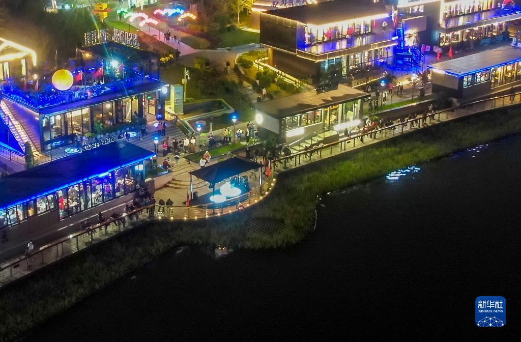 10月1日晚,人们在河北省唐山市南湖景区游览(无人机照片)。新华社记者 牟宇 摄
