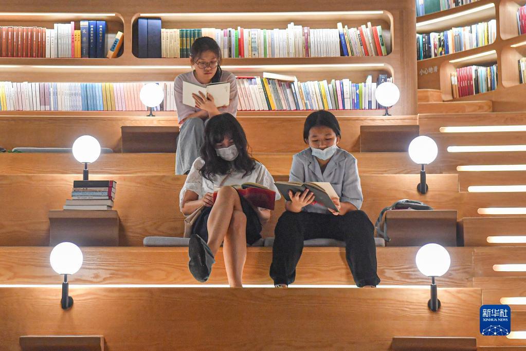 10月1日晚,读者在海南省海口市海口湾云洞图书馆阅读。新华社记者 蒲晓旭 摄