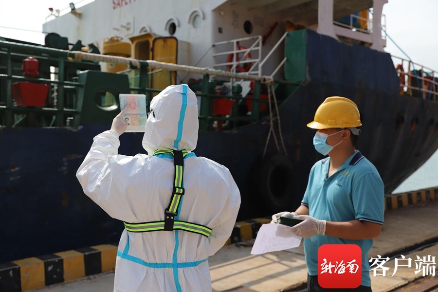 “请将证件举到胸前,摘下口罩!”头顶着烈日,3位执勤民警身着密不透风的防护服,在保持安全距离的情况下,井然有序地逐一对船上11名船员进行人证比对。欧俊辰说:“必须做到见人、见证、见船,人证一致,确保安全。”