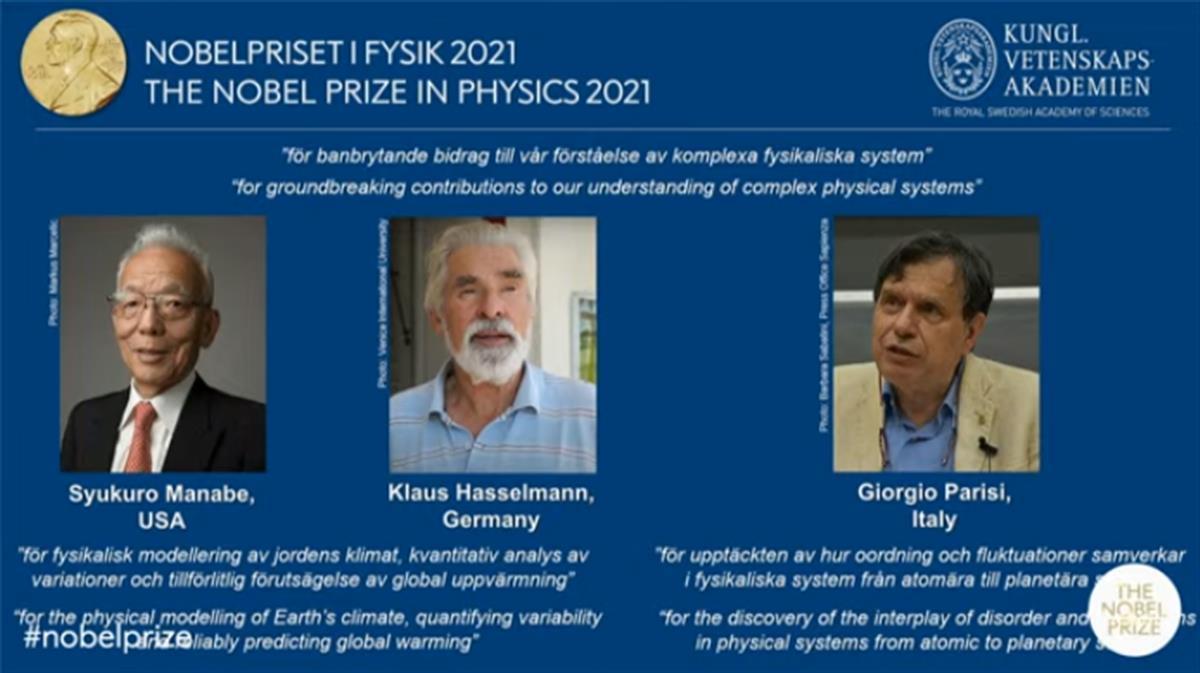 瑞典当地时间10月5日中午12点,诺贝尔奖委员会正式宣布,获得2021年诺贝尔物理学奖的是三位来自不同国家的科学家——美籍日裔的真锅淑郎(syukuro manabe),来自德国的克劳斯·哈塞尔曼(klaus hasselmann)以及意大利的乔治·帕里西(Glorglo parisi)。