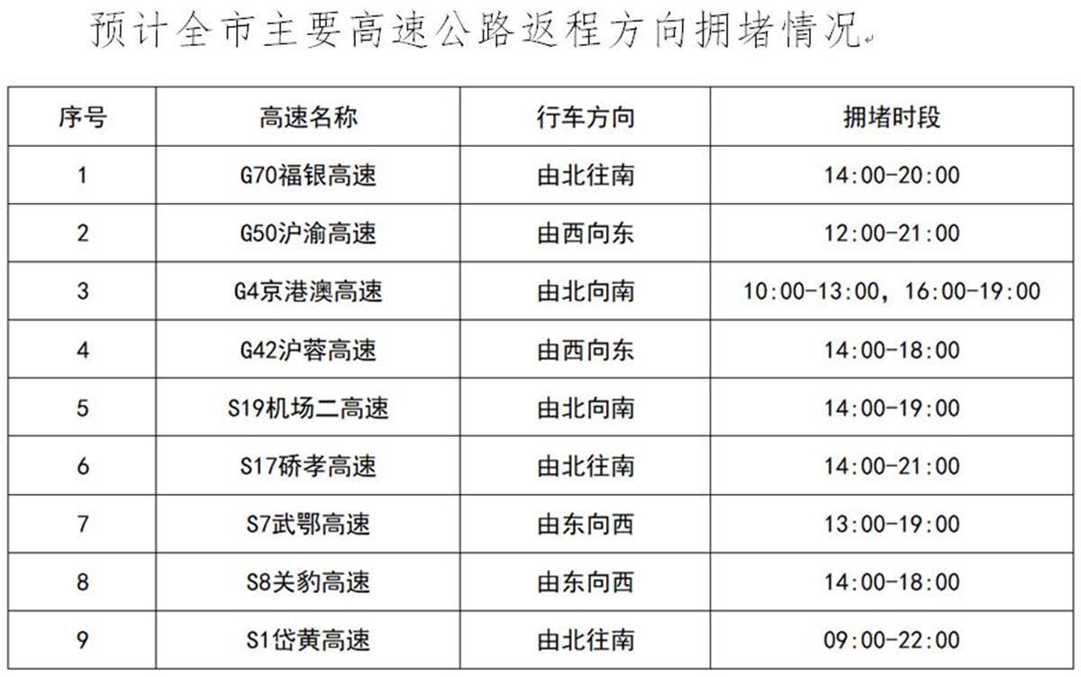 高速路段主要从当天14时开始出现明显的拥堵缓行现象,最高峰预计在15时至18时出现,拥堵或将持续7至9小时。
