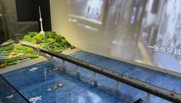 武昌桥头堡4楼的武汉长江大桥纪念馆内,摆放着一座长江大桥微缩模型。 记者杨荣峰 摄