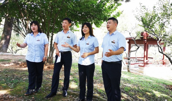 东湖听涛景区,四位主唱在小梅岭同唱《东湖绿心听涛美》。记者薛灵毓 摄