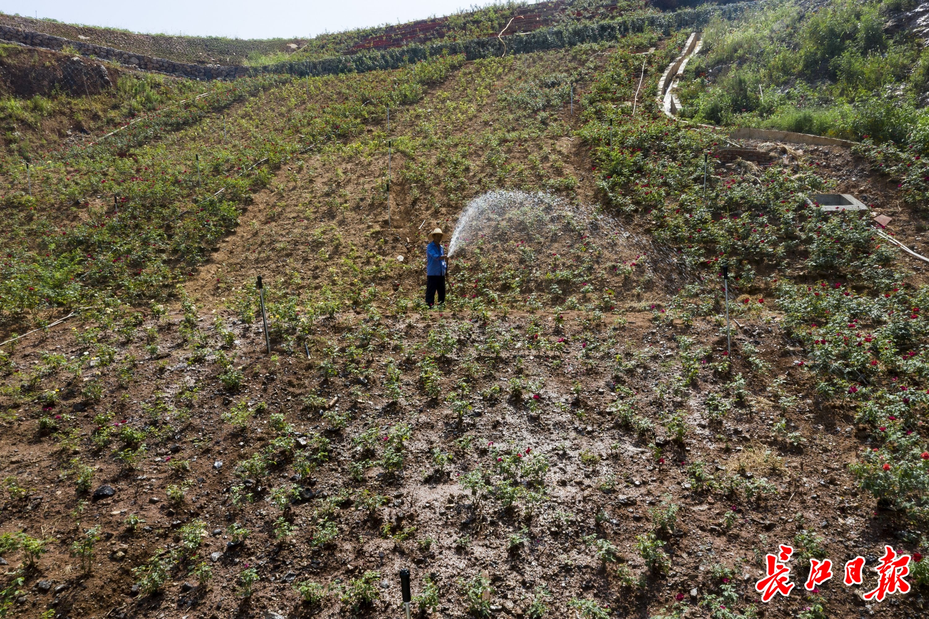 自动喷灌的水雾在阳光下映出道道彩虹,与山坡上的鲜花交相辉映;一条白练般的瀑布从数十米高的山崖上奔涌而下,注入一湾碧潭;山顶平地上,种下不久的黄豆已长出嫩绿的叶片……