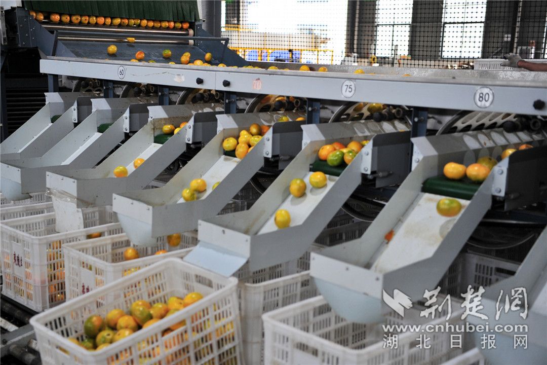 10月9日,在宜昌市夷陵红生态农业开发有限公司的柑橘自动化筛选车间,一个个橘子通过分级、包装、封箱,将销往各地市场。记者 闻玉强 摄制