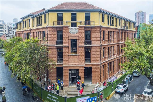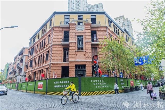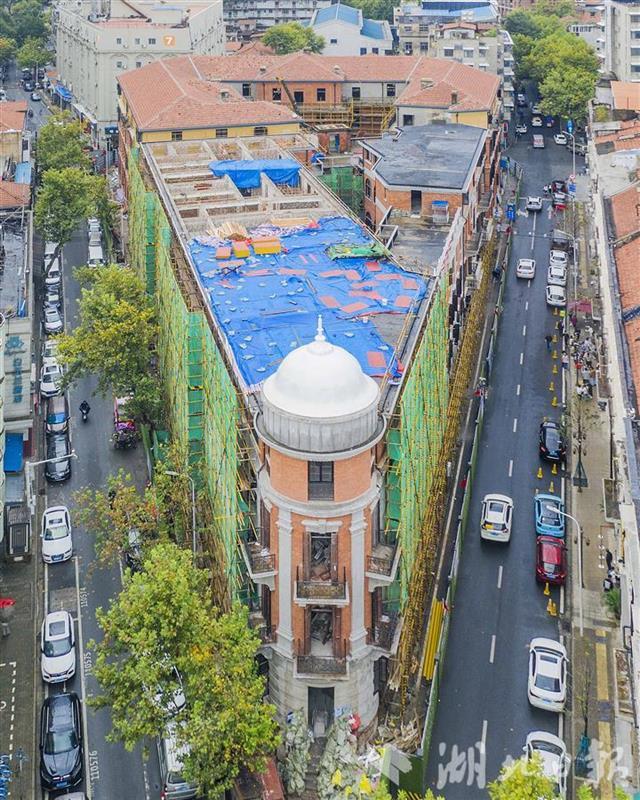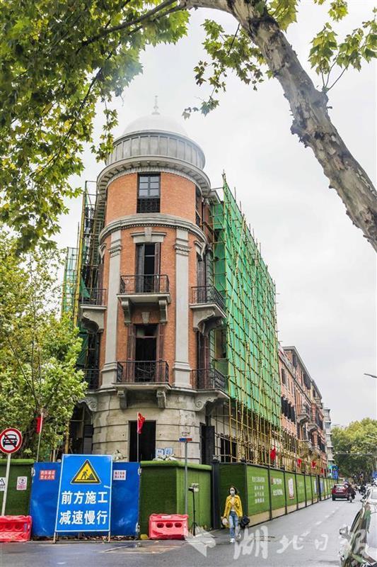 10月10日,外立面已修缮一新的巴公房子。今年111岁的武汉市优秀历史建筑巴公房子保护修缮工程项目,经过保护加固及内部改造装修,目前,外墙立面基本完工,正在加紧内部装修施工,俄罗斯风格的百年老建筑已经显现出全新的容貌。