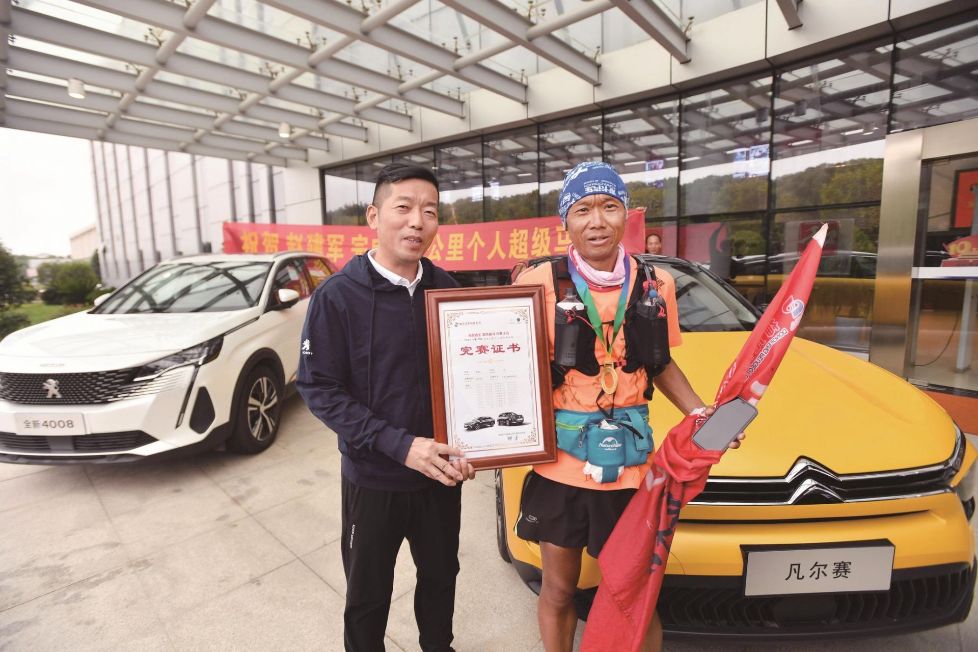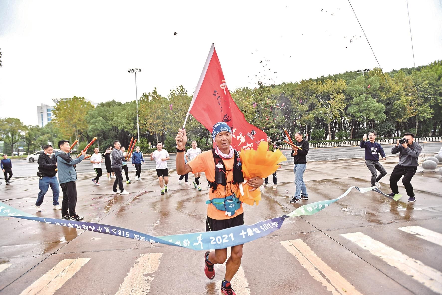 接近下午3时,在神龙公司总部大楼门口,极目新闻记者看到一个橙色的身影,单手高举着“超级马拉松”的旗帜从远处跑来。“我回来啦!”冲过终点线,赵建军与早早在此等候的妻子紧紧相拥,喜极而泣。