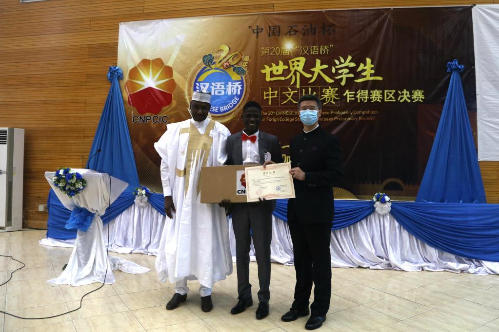 2021年7月23日,在乍得首都恩贾梅纳,中国驻乍得大使李津津(右)为第20届“汉语桥”世界大学生中文比赛乍得赛区冠军佛朗哥(中)颁奖。(中国驻乍得大使馆供图)