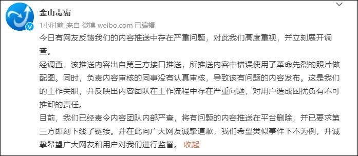 @金山毒霸 发微博回应称,经调查,推送内容出自第三方,审核不严导致该内容发布,责令内容团队内部严查,向网友诚挚道歉,希望类似事件下不为例。