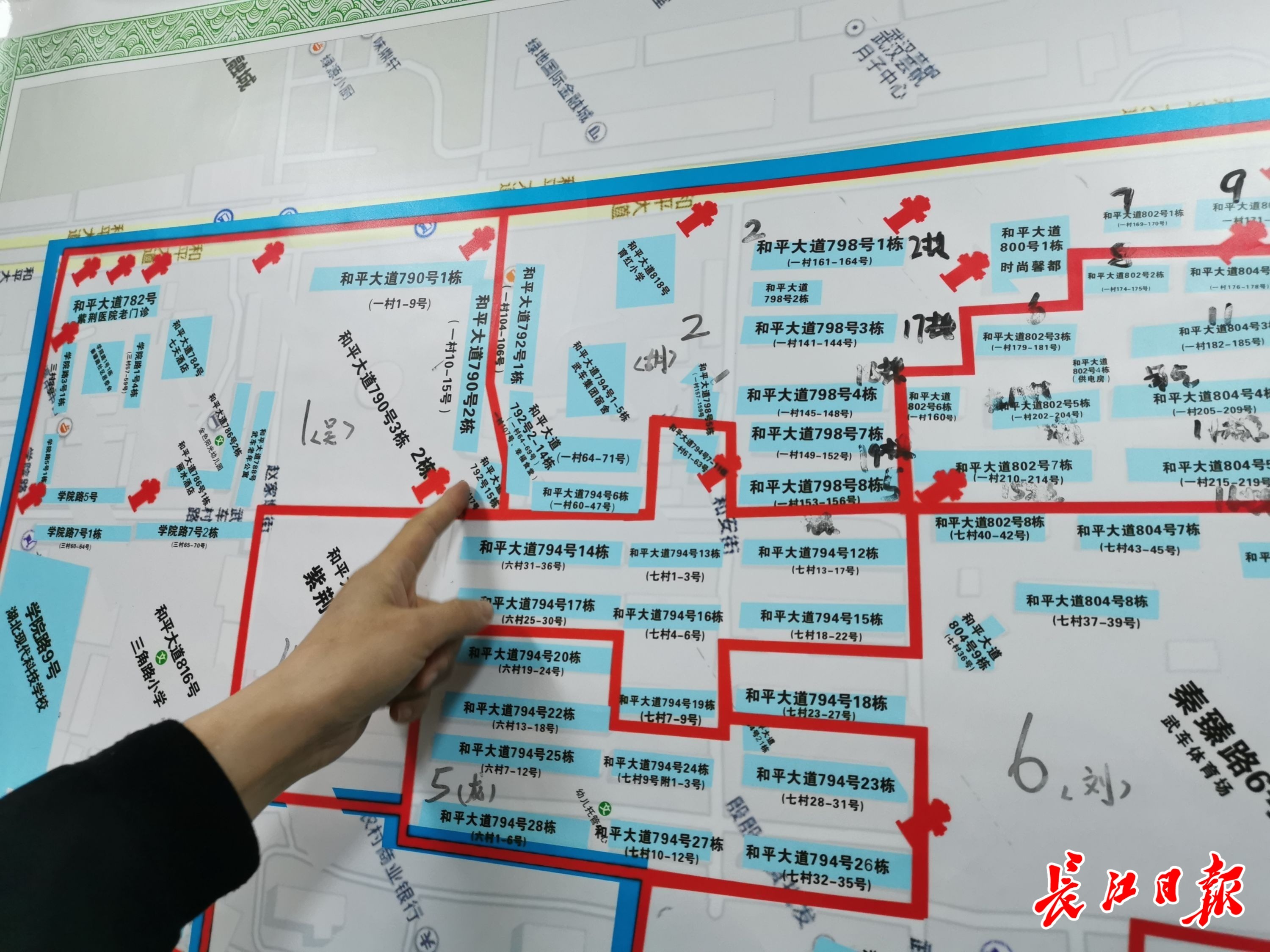 记者看到,该社区办公室内,悬挂了一张网格地图。图上标识了各楼栋的新编号、老编号以及道路编号。