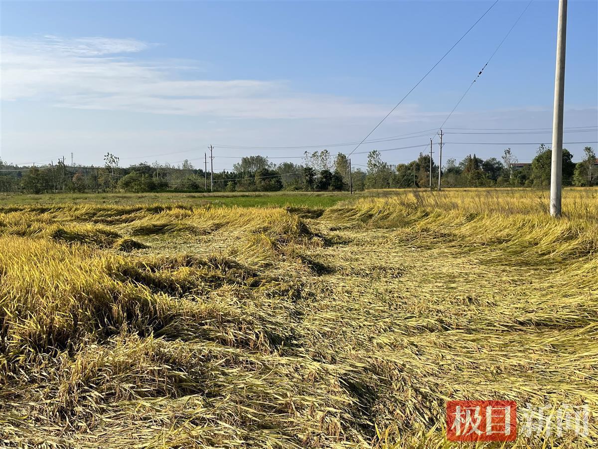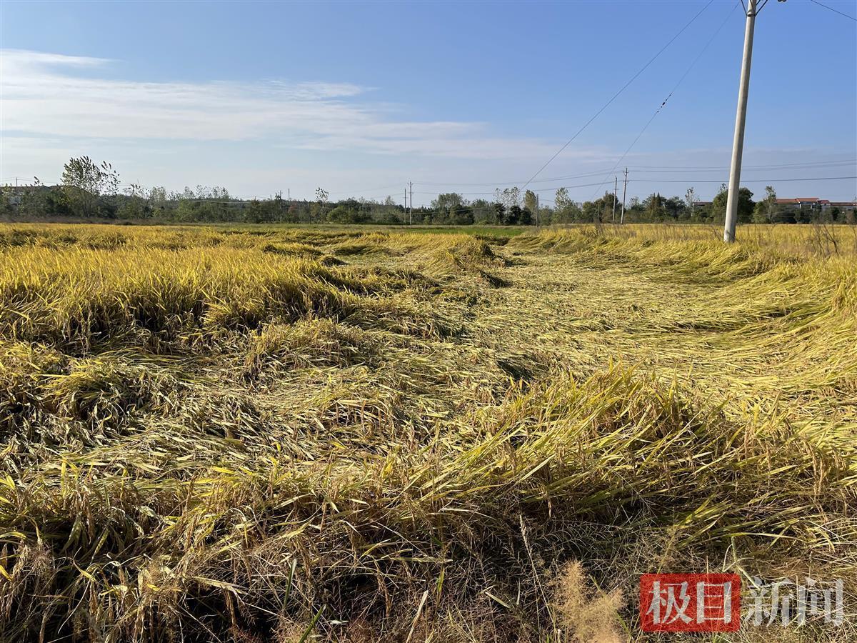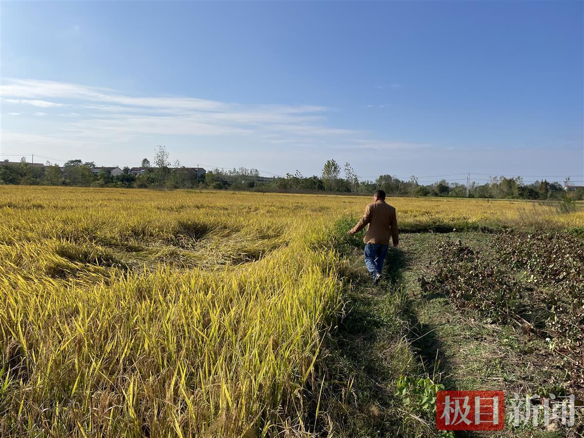 10月11日,记者来到新洲区何畈村,种植户何春泉的稻田一片狼藉。原本已经成熟的水稻发生不同程度的倒伏,倒伏的地方像被人为踩踏过或是重物碾压过一样。