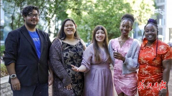 在汉外国人涂优异、方思思、迪丽、迪亚、费丽莎为中国戏曲点赞(从左至右)。长江日报记者肖僖 摄