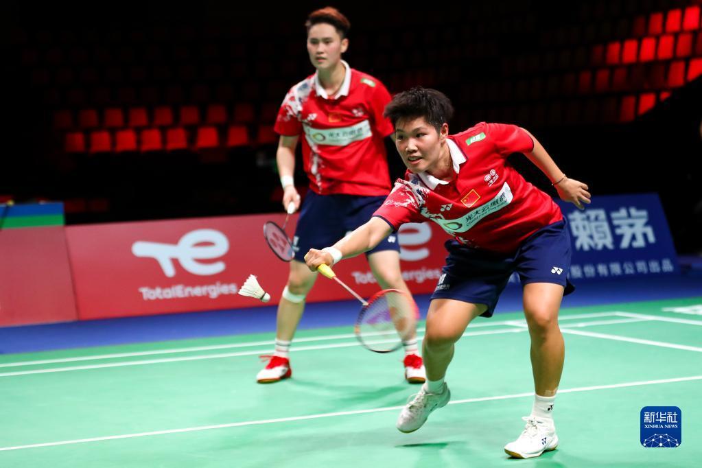 10月12日,中国队选手黄东萍(右)/李汶妹在女双比赛中以2比0战胜丹麦队选手博尔/波尔森。