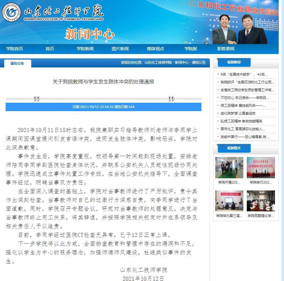 12日晚11时30分,山东化工技师学院发布“关于教师与学生发生肢体冲突的处理通报”称,10月11日下午3时许,学院兼职实习指导教师刘老师与李同学上课期间因课堂提问引发言语冲突,进而发生肢体冲突。