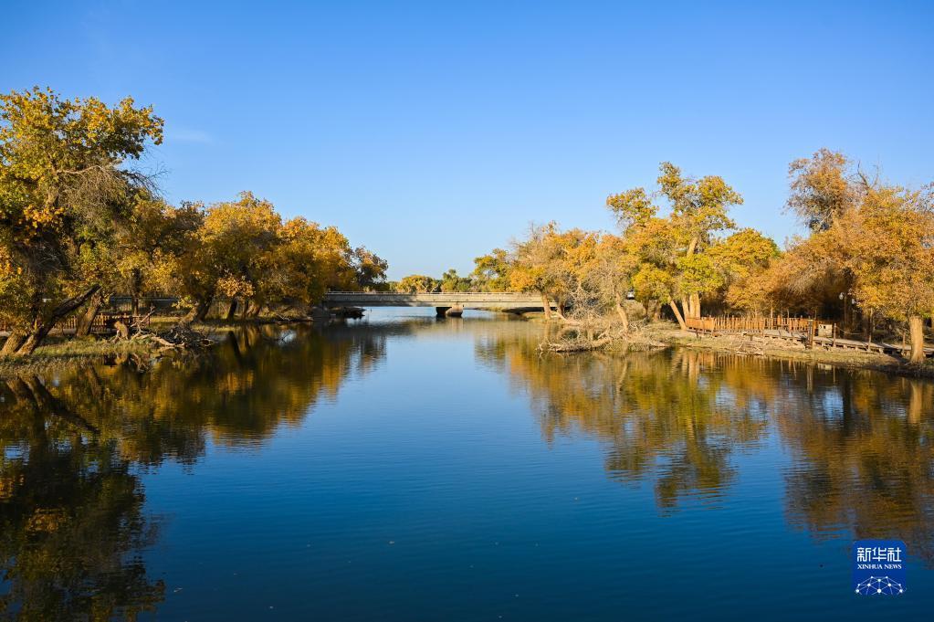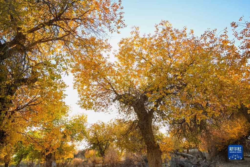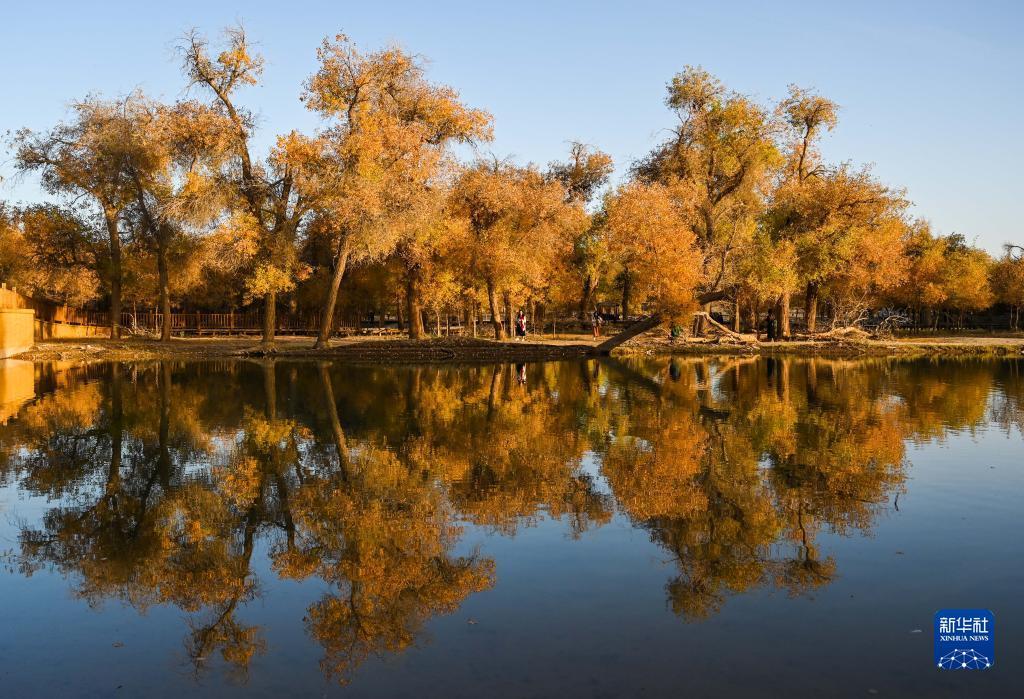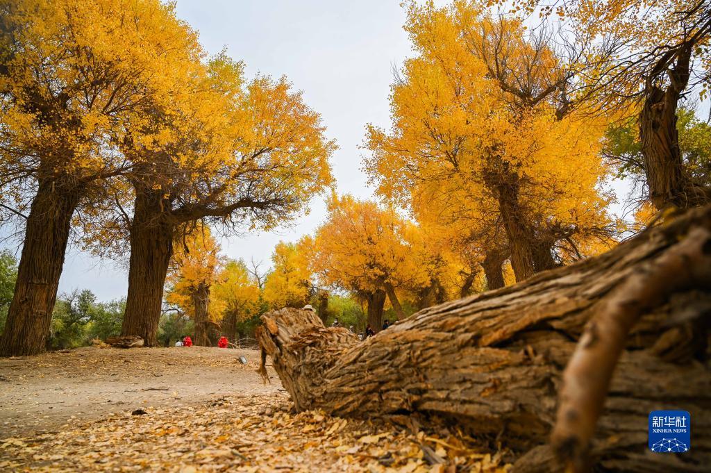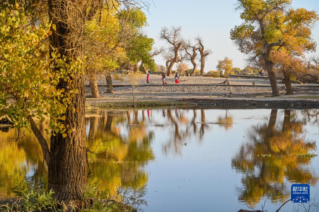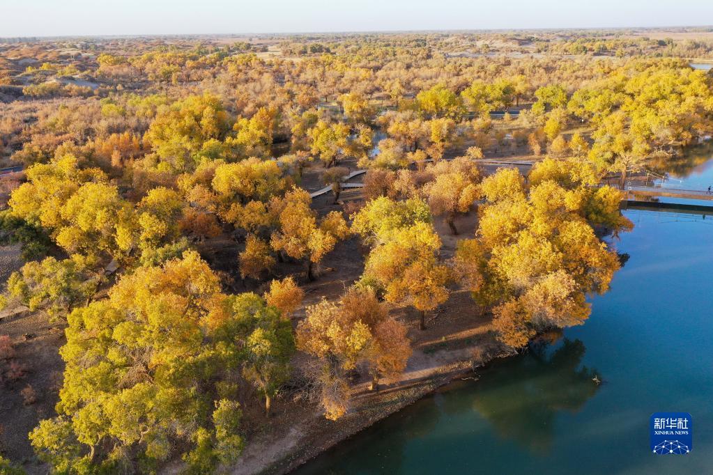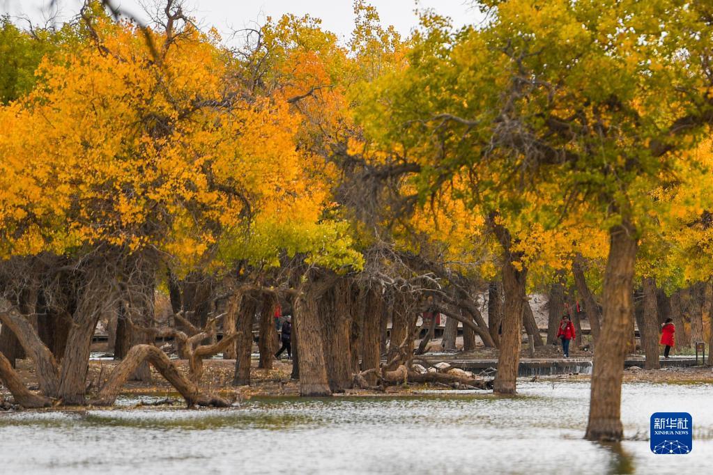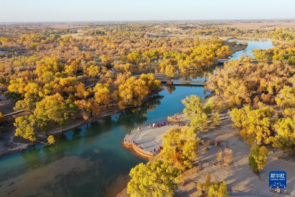 金秋时节,内蒙古自治区阿拉善盟额济纳旗的胡杨林披上金装,吸引众多游客前来观赏。