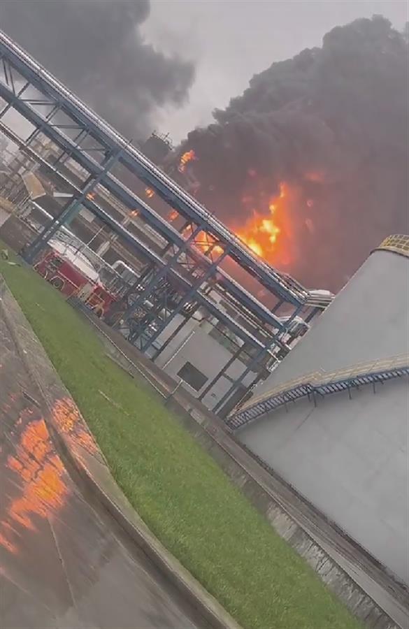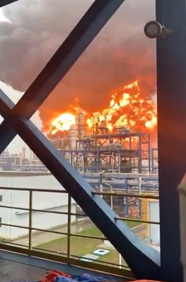 网友拍摄的多段视频显示,一工业园区内发生爆炸起火,巨大的火球冲向天空,现场浓烟滚滚,大火不断升腾蔓延。记者通过视频注意到,起火面积较大,周边分布着各种管道及厂房等工业设施,现场还下着雨,部分地面有积水。