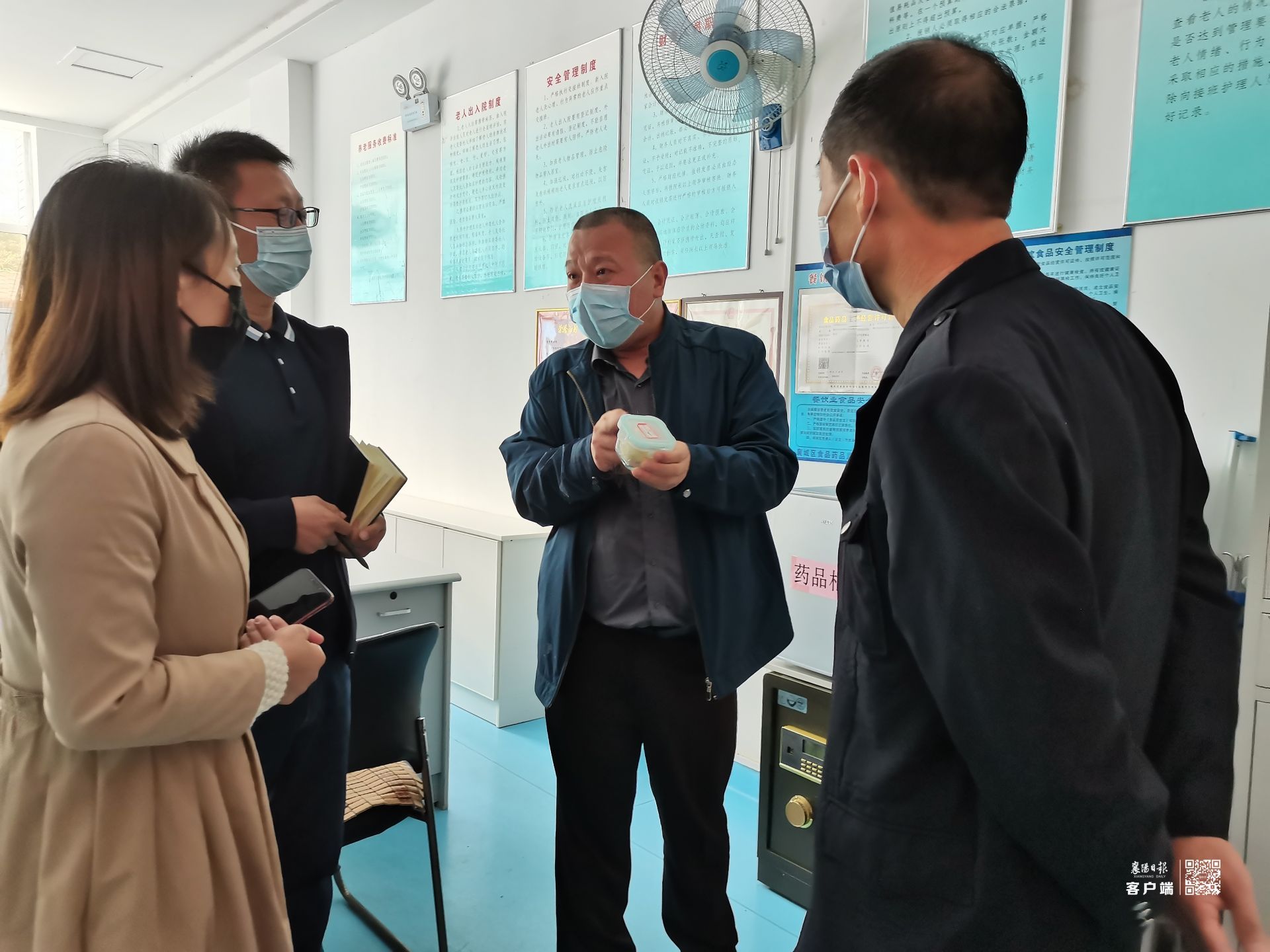 在樊城区中原路“春和瑞怡老年公寓”的食堂操作间,检查人员指出存在操作台置物架杂乱、留样食品混装等细节问题。
