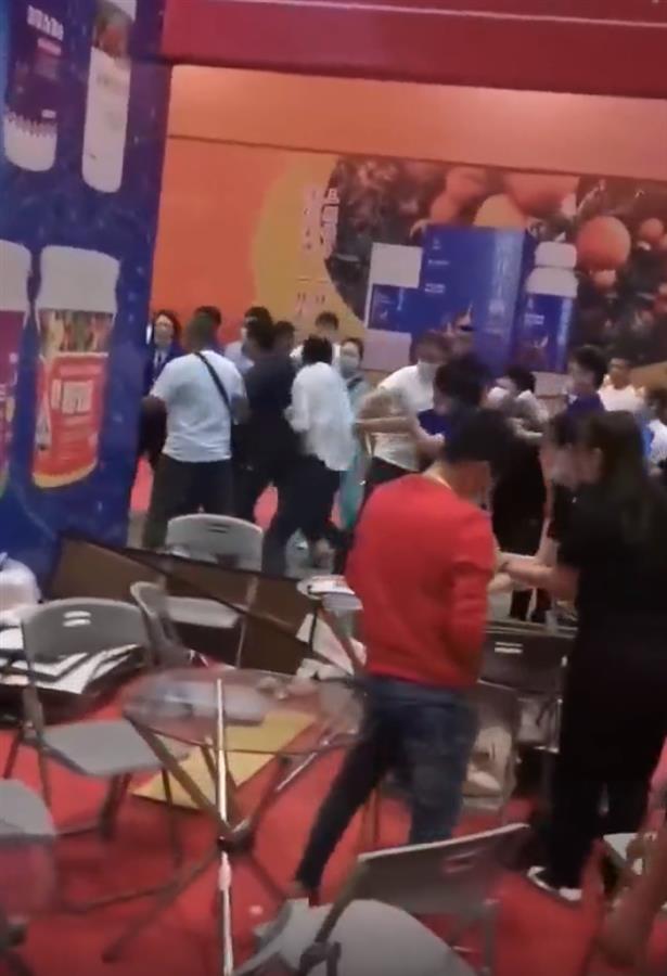 据网传视频显示,十余人在展厅中纠缠在一处,互相拉扯打斗,有人甚至举起折叠椅在空中挥舞砸人。打架者中有人穿着展商工作服,有人身背公文包。有工作人员在一旁劝阻,但打架者持续互相推拉扯斗。