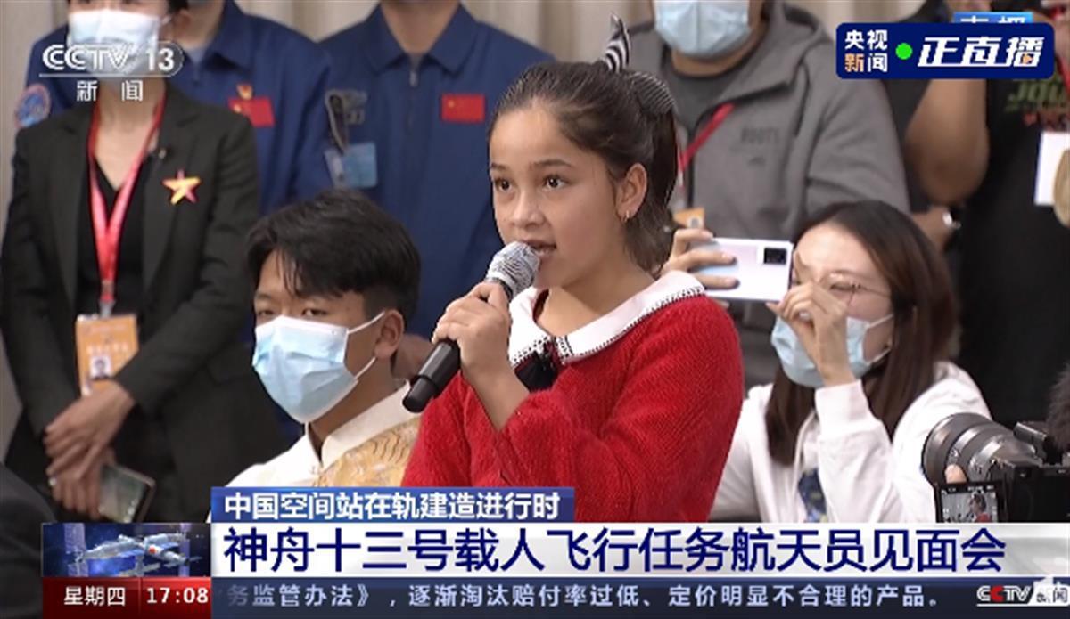 见面会结束后,极目新闻记者与这位来自新疆的小朋友聊了聊她的航天梦。她告诉极目新闻记者,自己今年11岁,上小学四年级,从小就对太空充满向往,想当一名航天员,她认为宇宙中充满着很多未知的秘密。通过交流,极目新闻记者还了解到,这位小朋友曾通过“青春与星空对话”中西部青少年与载人航天面对面主题活动,在海南文昌卫星发射中心见过航天英雄杨利伟,如今她又见到了在太空授课的航天员王亚平,心情十分激动。
