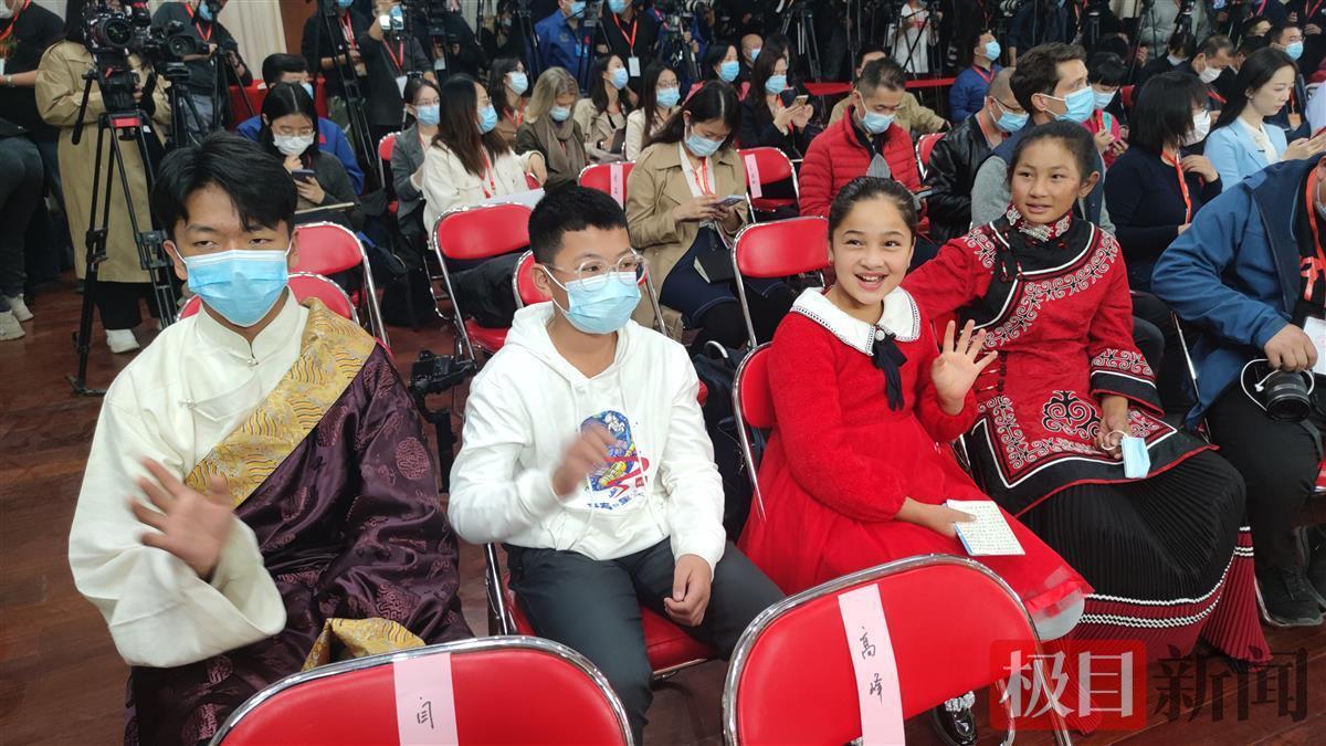少数民族小朋友在航天员见面会现场(记者丁鹏拍摄)