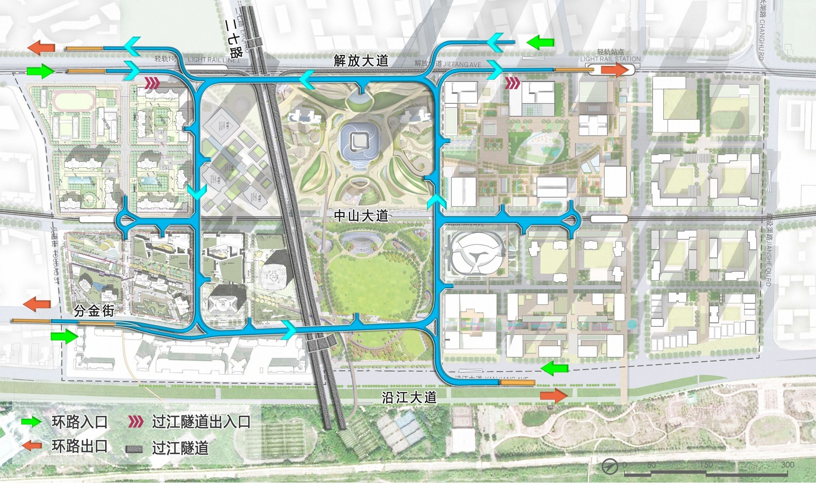 龚星星介绍,区域内的道路是一个立体系统,规划将通过清晰的标志,让司机在地上、地下都不会晕头转向。比如进出地下环线采用“四进四出”的方式,解放大道、沿江大道、分金街均有进出匝道,构成1.8公里的闭环,市民可通过地下环路直达城市主干道。
