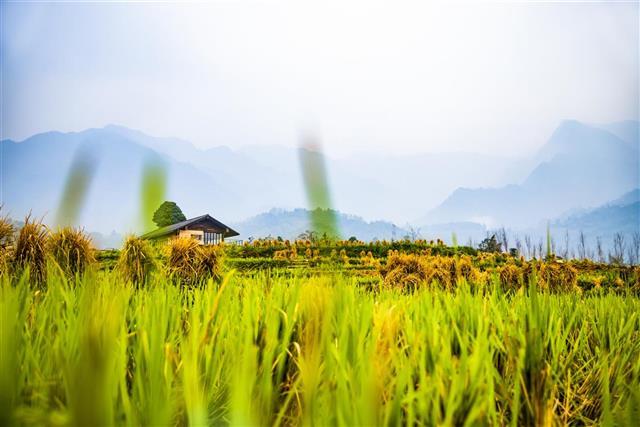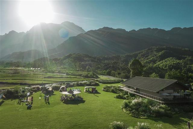 小桥流水、稻浪翻滚,孩子们在草地上嬉戏,大人们在水边休憩,不远处是美学馆、田间餐厅、营地酒店,满足游客度假各种所需……