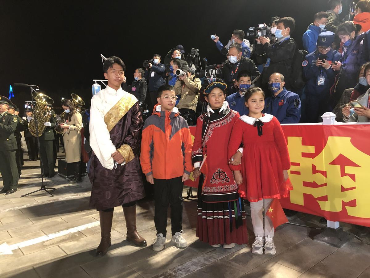 参加航天员出征仪式的小学生伊丽姆努尔·约麦尔阿卜拉(右一)