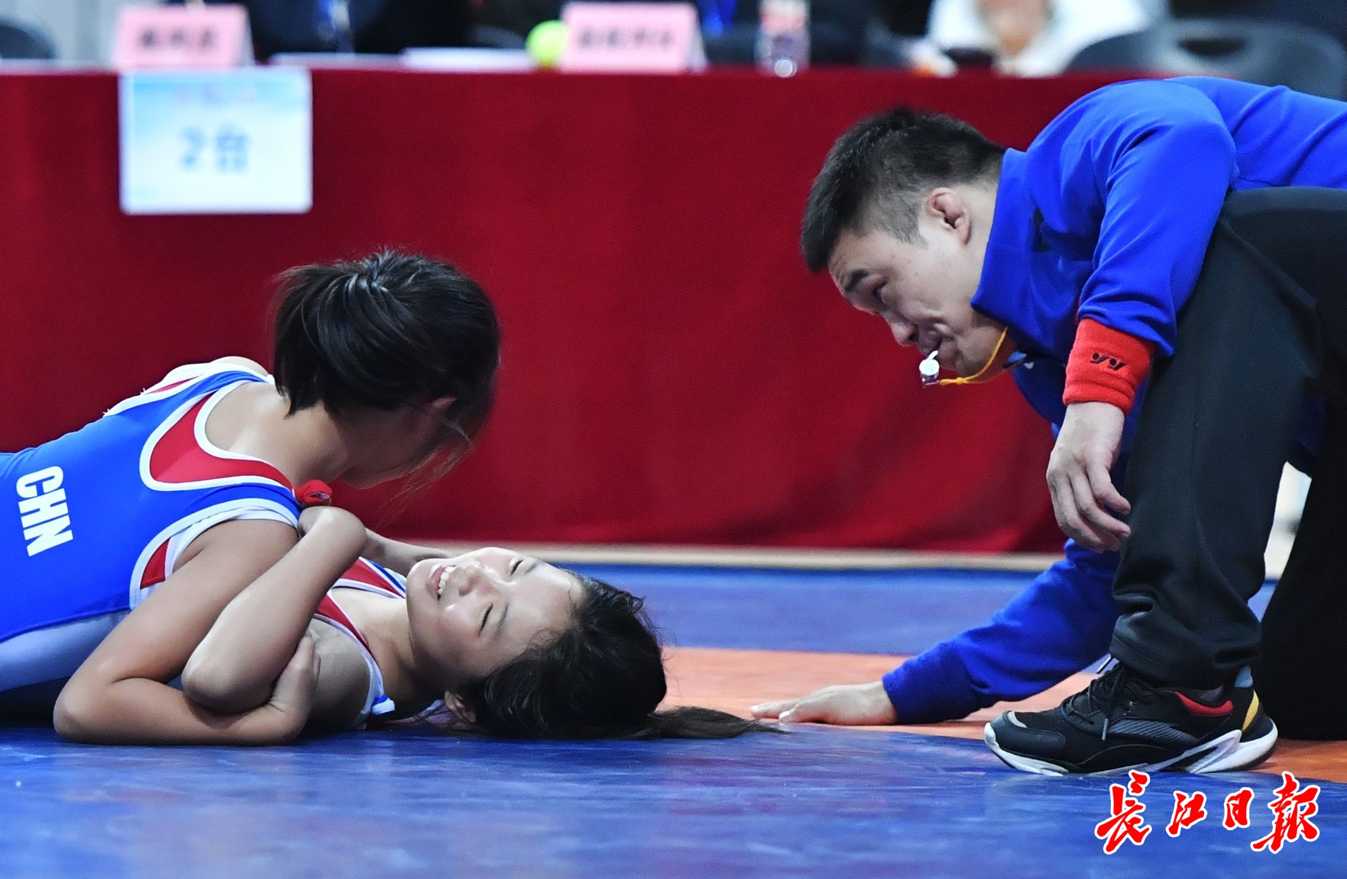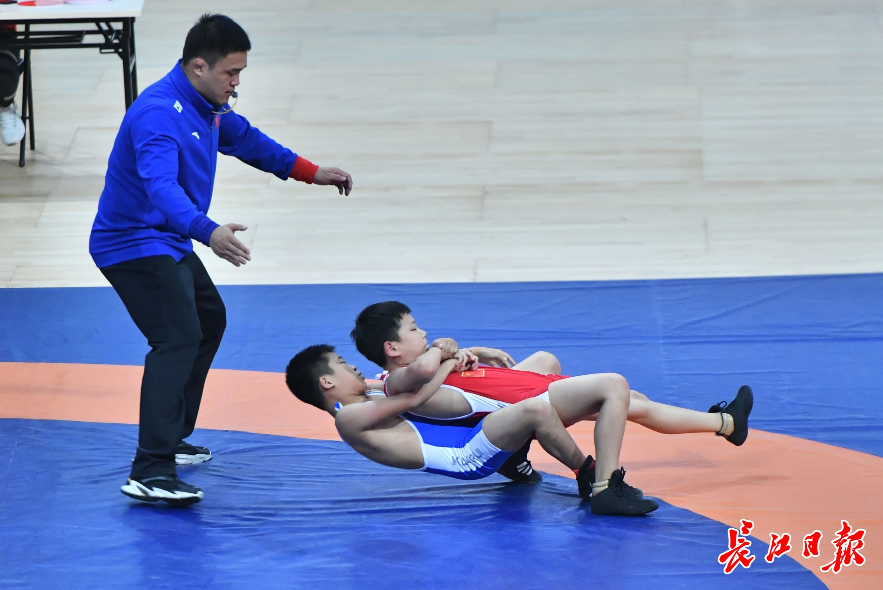 长江日报大武汉客户端10月17日讯 10月15日,武汉市第十一届运动会青少年摔跤比赛在五环体育中心举行。来自8个城区的180名少年摔跤手齐聚一堂切磋技艺,其中还包括44名女选手。比赛现场,为使孩子们尽量避免意外受伤,场上的裁判员可谓呵护备至,场上一旦出现可能引发伤害的危险动作就及时伸手甚至直接叫停,因而满场打转的裁判员们也格外引人关注。(长江日报记者喻志勇 摄影报道)