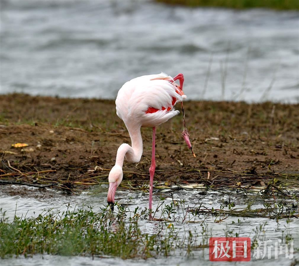“龙泉水库是一座中型水库,掇刀区河湖长巡湖时,在水库大坝东南角芦苇滩涂上发现这只特别的‘鸟’。”荆门龙泉水库管理处负责人告诉极目新闻记者,大红鹳又名大火烈鸟,是体大而身高(130厘米)的偏粉色水鸟,在当地是难得一见的珍稀鸟类。