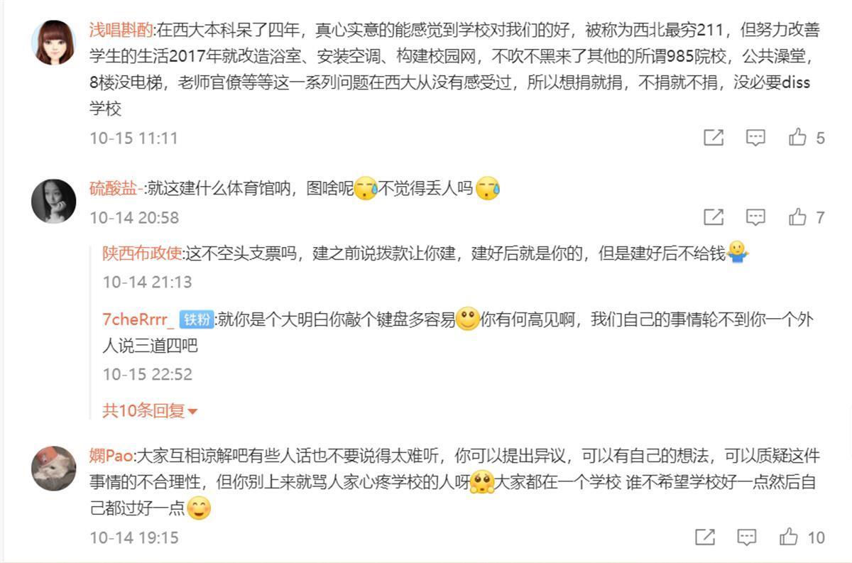 当天,不少校友看到这个消息,却直呼“辛酸”。一位西北大学校友在评论区发言称,“以前就知道西大穷,转眼毕业快十年,没想到还是穷。奶茶钱可以捐,为母校这都不是事儿。”这位校友还称,“这所大学真的很好,可惜受困于地域出身。”