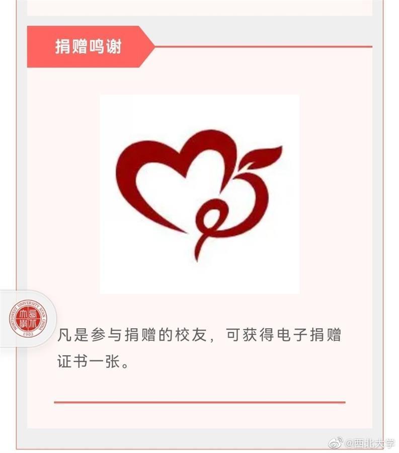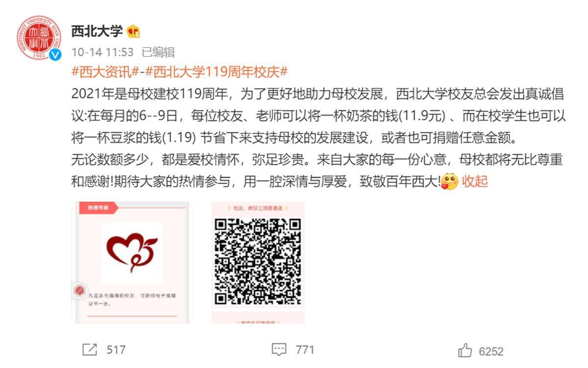 校庆前夕,10月14日中午,西北大学官微发布消息称,为了更好的助力母校发展,西北大学校友总会发出真诚倡议:在每月的6-9日,每位校友、老师可以将一杯奶茶的钱(11.9元)捐出;在校学生可以将一杯豆浆的钱(1.19元)节省下来支持母校的发展,或者也可以捐赠任意金额。