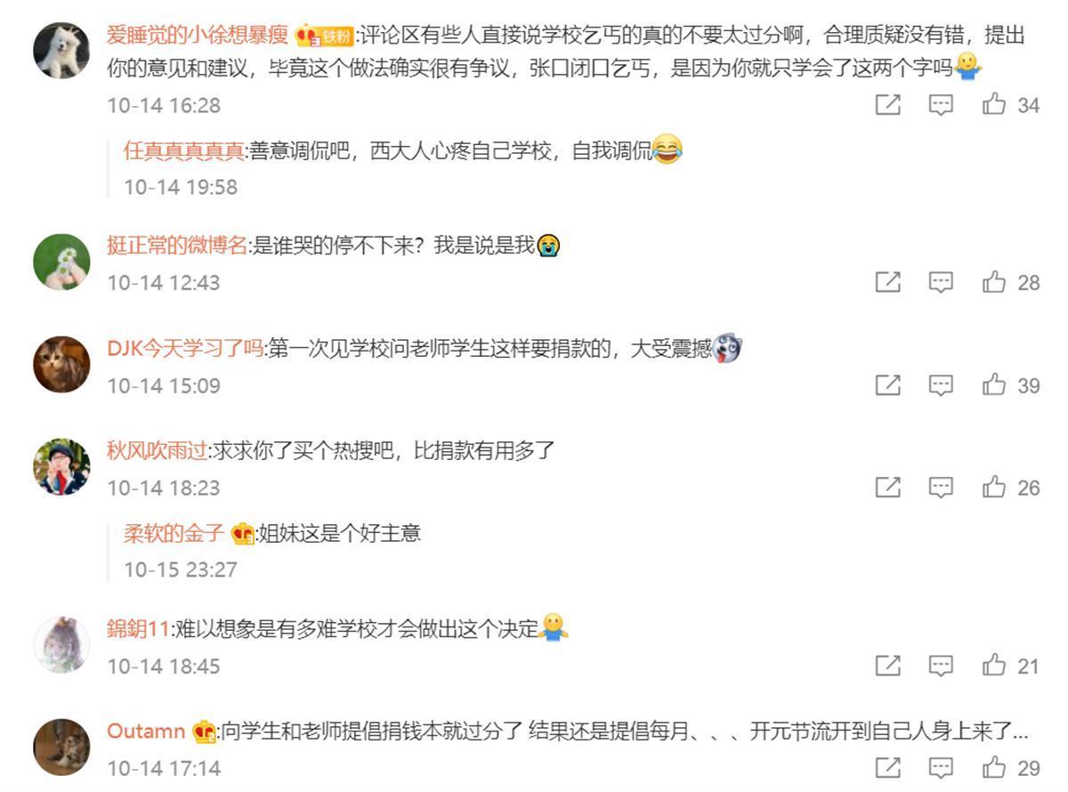 该内容发出后,有网友称学校是“乞丐”行为,为了那几块钱来募捐;还有网友开玩笑称,“西北大学中国最穷211的称号坐实了”。