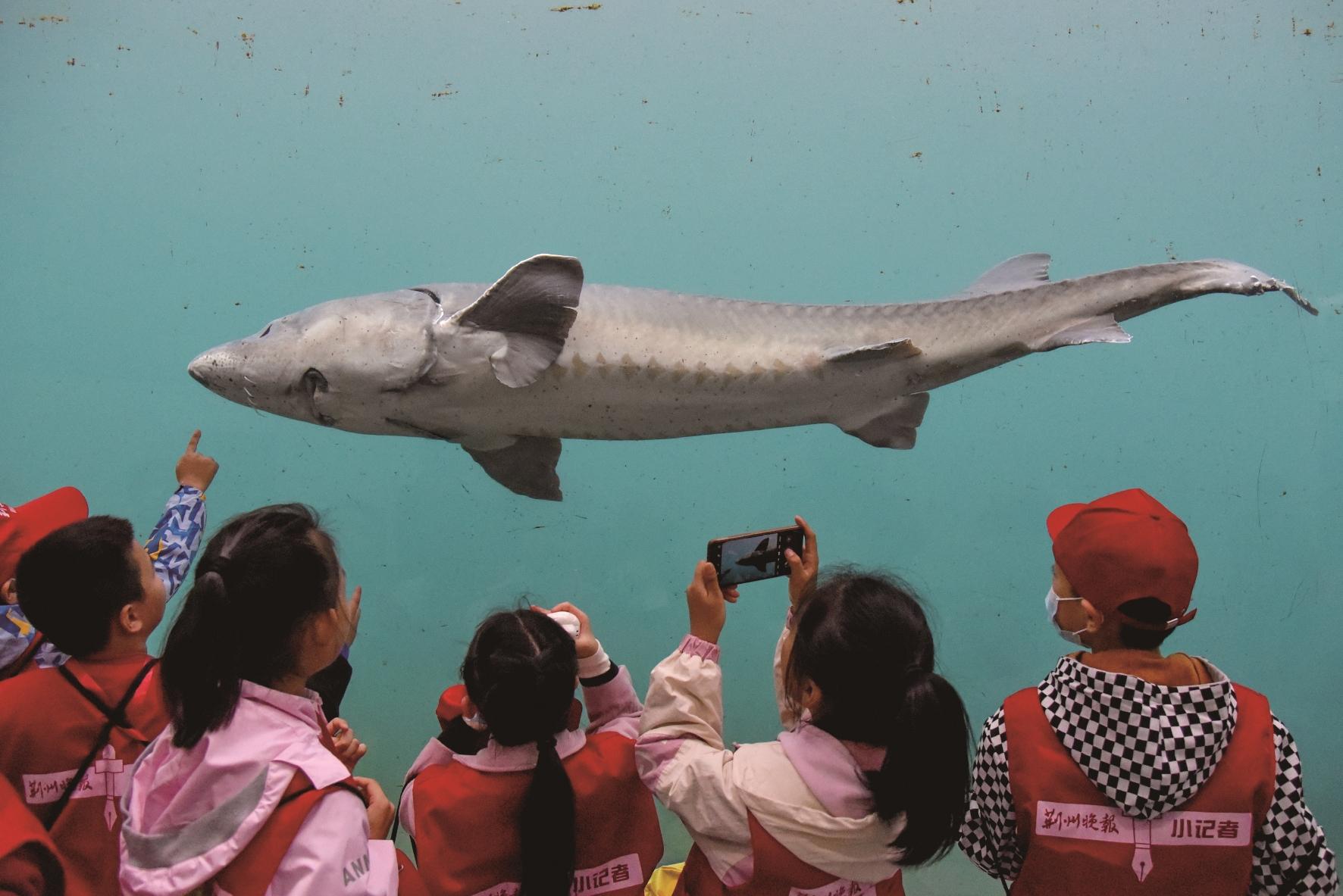 在科普展示区,小朋友们隔着玻璃,兴奋地观看着水箱中游来游去的中华鲟。不少小朋友还拿出绘画本,现场描摹中华鲟的形状。