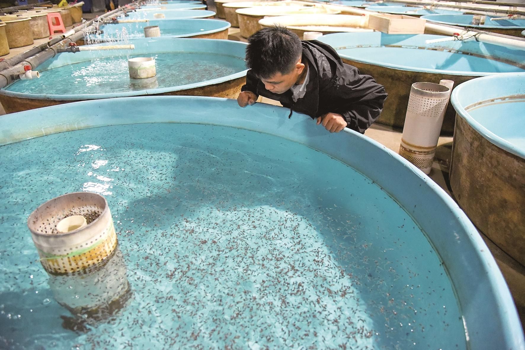 “之后,子鱼进入外源性营养阶段,要开口觅食。”罗江说。刚开始,子鱼的食物为水蚯蚓,约15天后变为混合饲料。