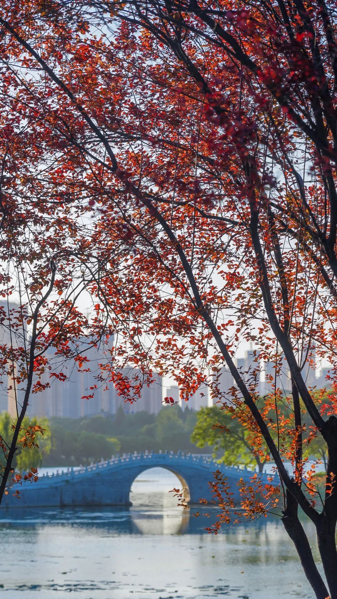 一树红叶李与公园里的拱桥同框,远处还有绿树掩映,初秋的氛围感来了,明媚的阳光下,甚至觉得有一刻自己过了个北方的秋天。