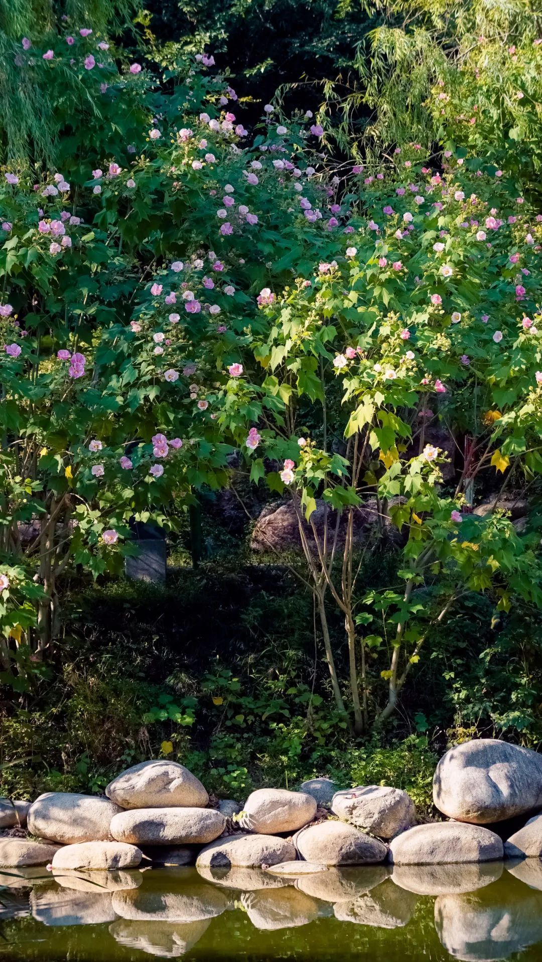 坐落在闹市之间的王家墩公园,以木芙蓉为园花,公园流水小筑和同创桥区域,点缀种植有近百株木芙蓉。