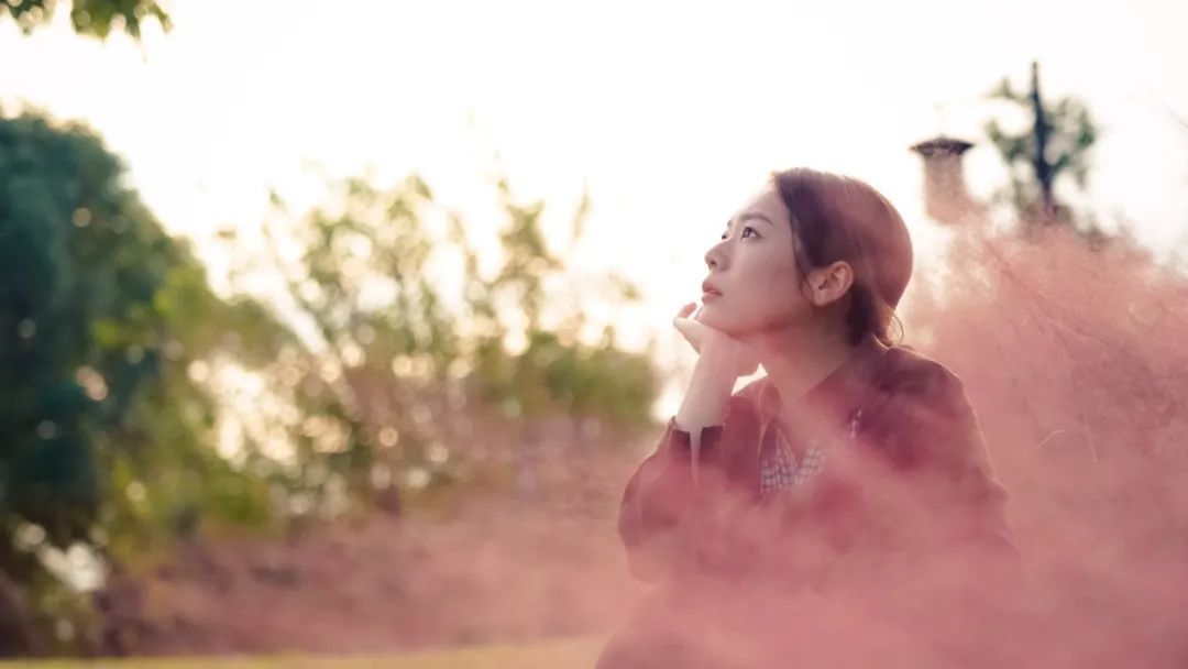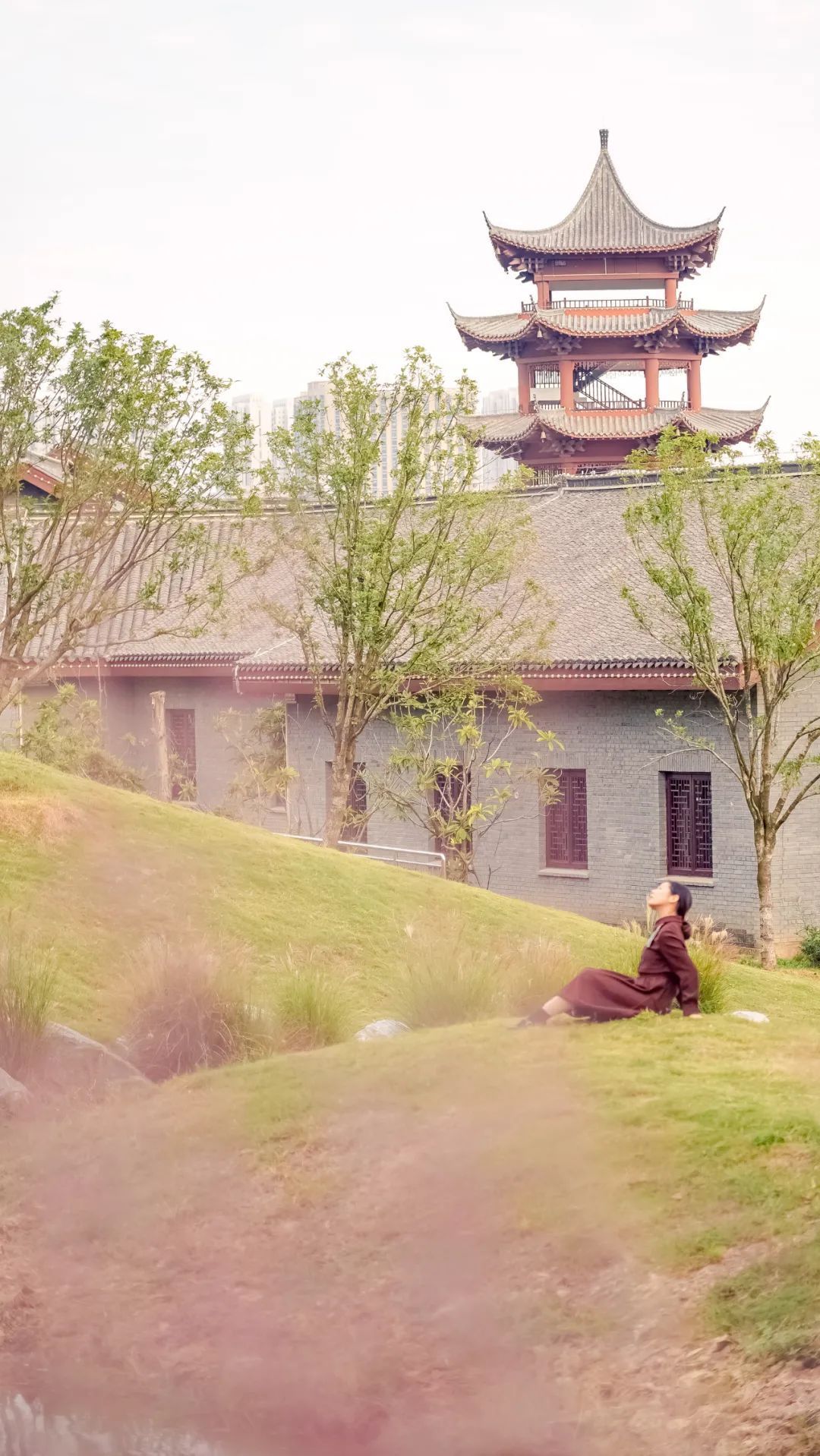 透过一层粉色滤镜,周边的景色也更加动人,对面的小山一片青翠,中式建筑古香古色,小瀑布流水叮咚,远离城市中心的这里,仿佛一处世外桃源,心里格外安稳。
