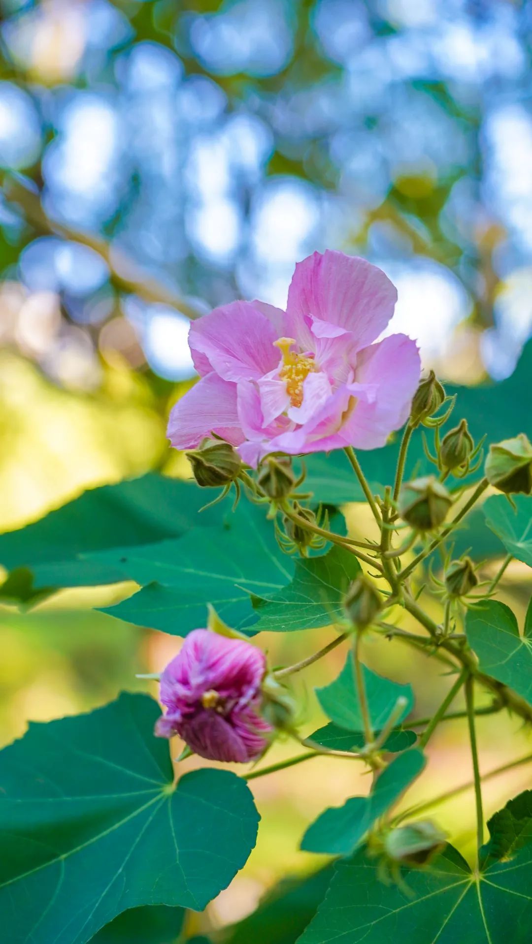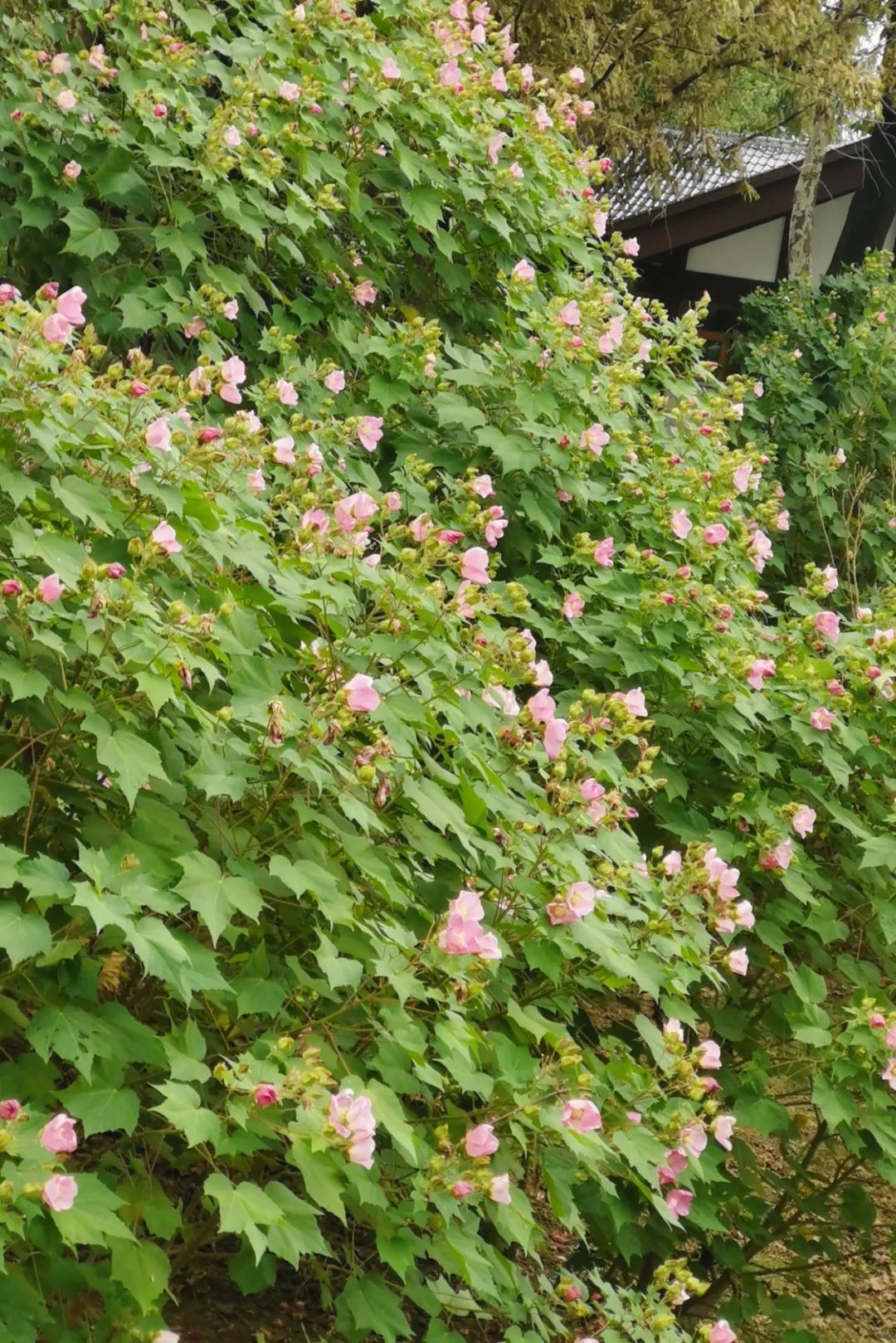 粉色的花好像都更青睐春天,例如樱花、桃花、海棠,但木芙蓉却独自隐逸在清冷的秋日,正如苏东坡的诗“千林扫作一番黄,只有芙蓉独自芳”。