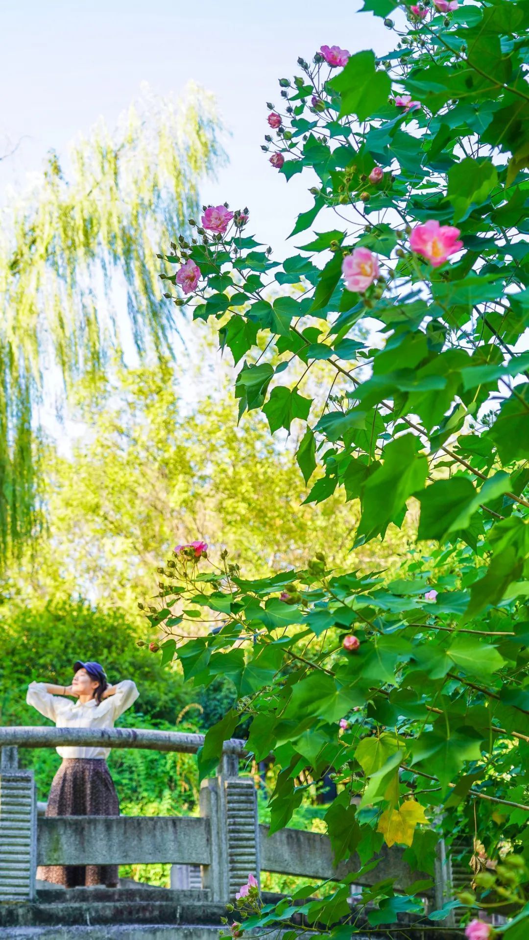 蜿蜒的小路边、厚重的石桥旁,突然出现一株开满粉色花朵的木芙蓉,在寂寥的秋日,实在让人惊喜万分。