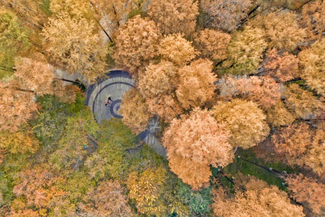 从上空看秋天的解放公园,只见茂密的杉树层层叠叠,绿与红交织,显得和谐而可爱。这里的水杉多半栽种在湖边,一个个清秀挺拔倩影倒映在清澈的湖水中,仿佛在波光中复制出了另一个秋,亦真亦幻。