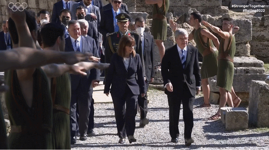 希腊总统萨克拉罗普卢、国际奥委会主席巴赫、希腊奥委会主席卡普拉洛斯与北京冬奥组委副主席于再清共同出席了当天的采集仪式。