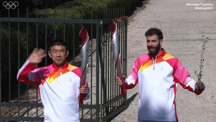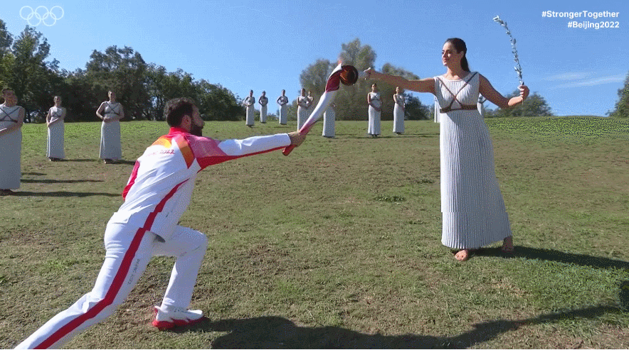 在一段舞蹈表演后,最高女祭司将燃起的火炬及象征和平和荣耀的橄榄枝传递给第一棒火炬手——希腊滑雪运动员安东尼乌,他也成为北京冬奥会的首位火炬手。