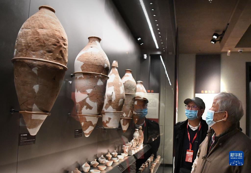 10月17日,北京大学考古专家李伯谦(右)在庙底沟仰韶文化博物馆内观看展品。