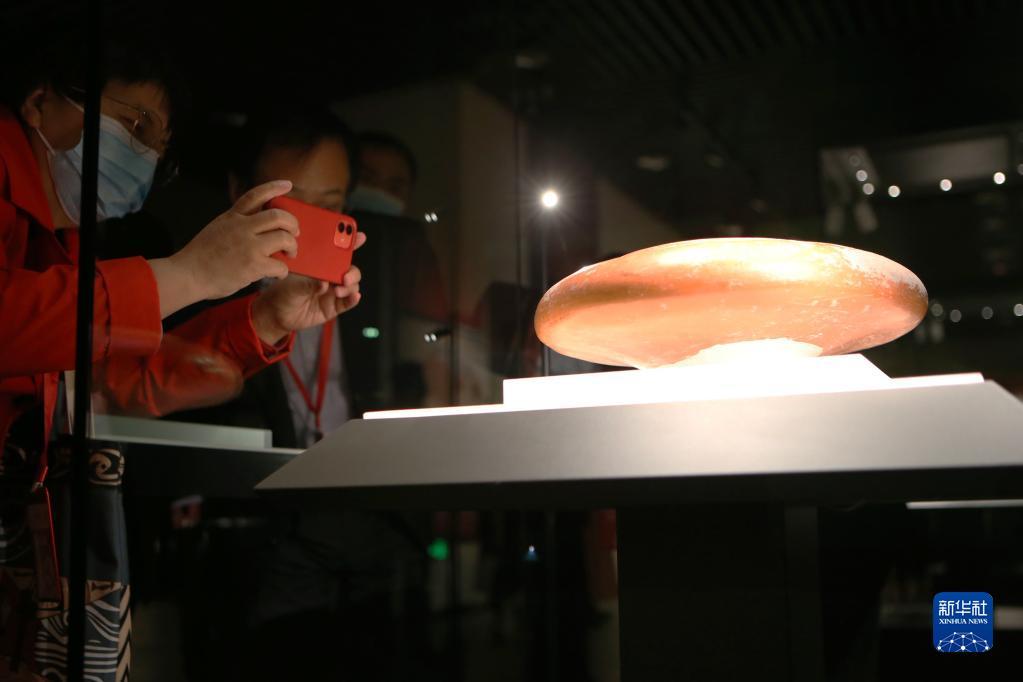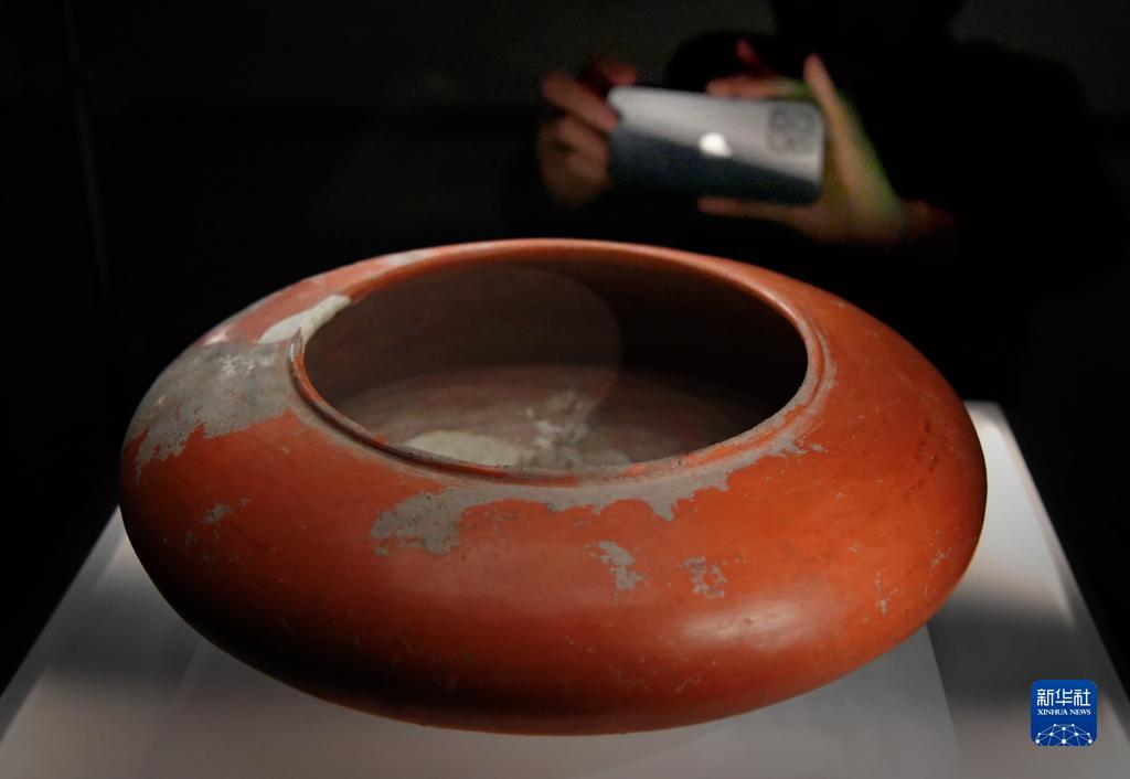 10月17日,参观者在庙底沟仰韶文化博物馆内拍摄展品红陶钵。