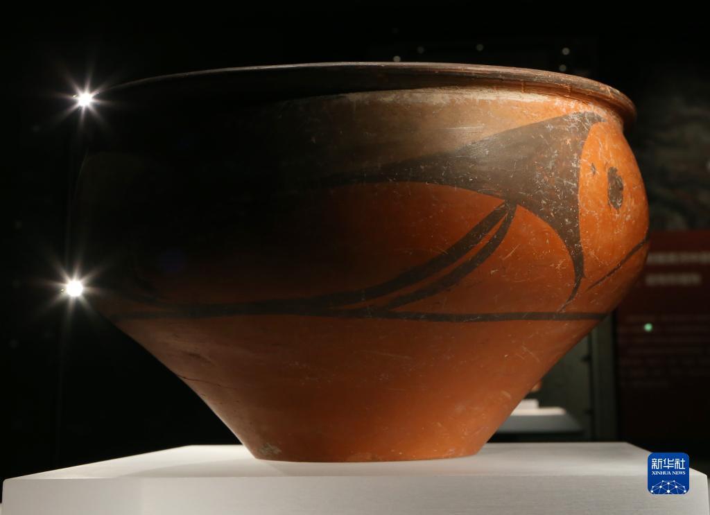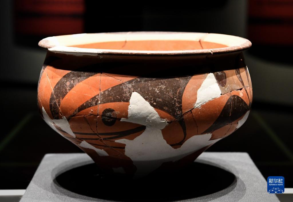 这是10月17日在庙底沟仰韶文化博物馆内拍摄的弧线三角纹彩陶盆。