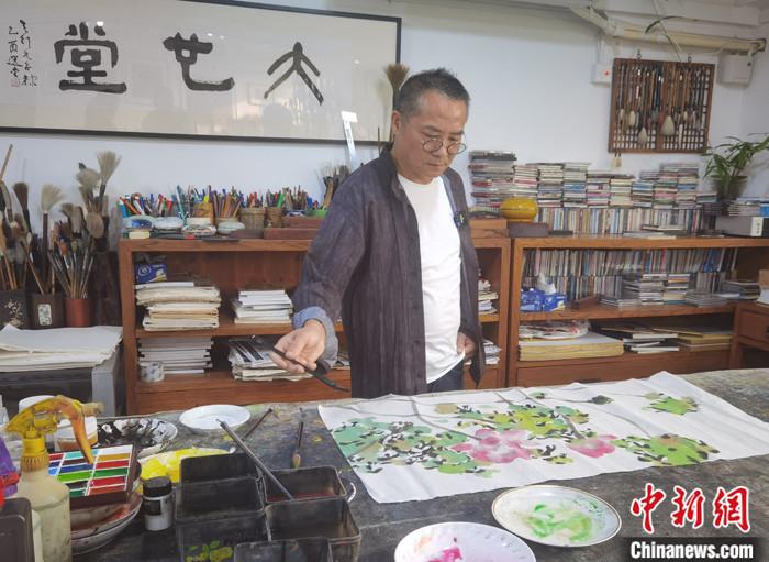 香港美术家协会主席、著名画家林天行在创作中。 中新社记者 索有为 摄