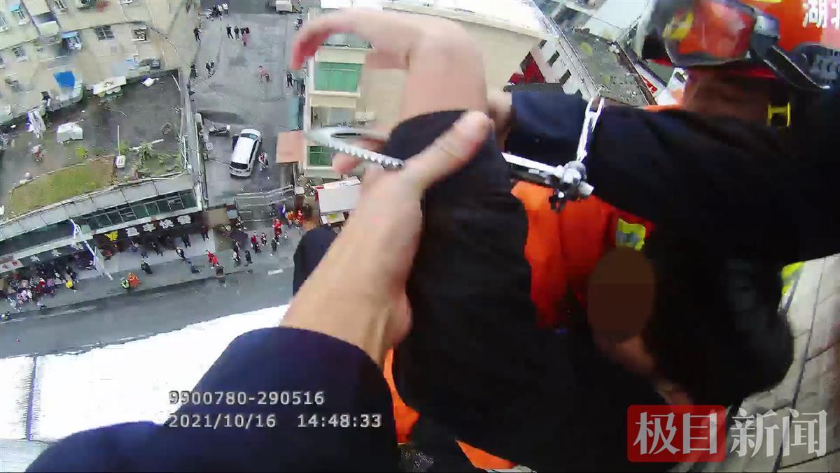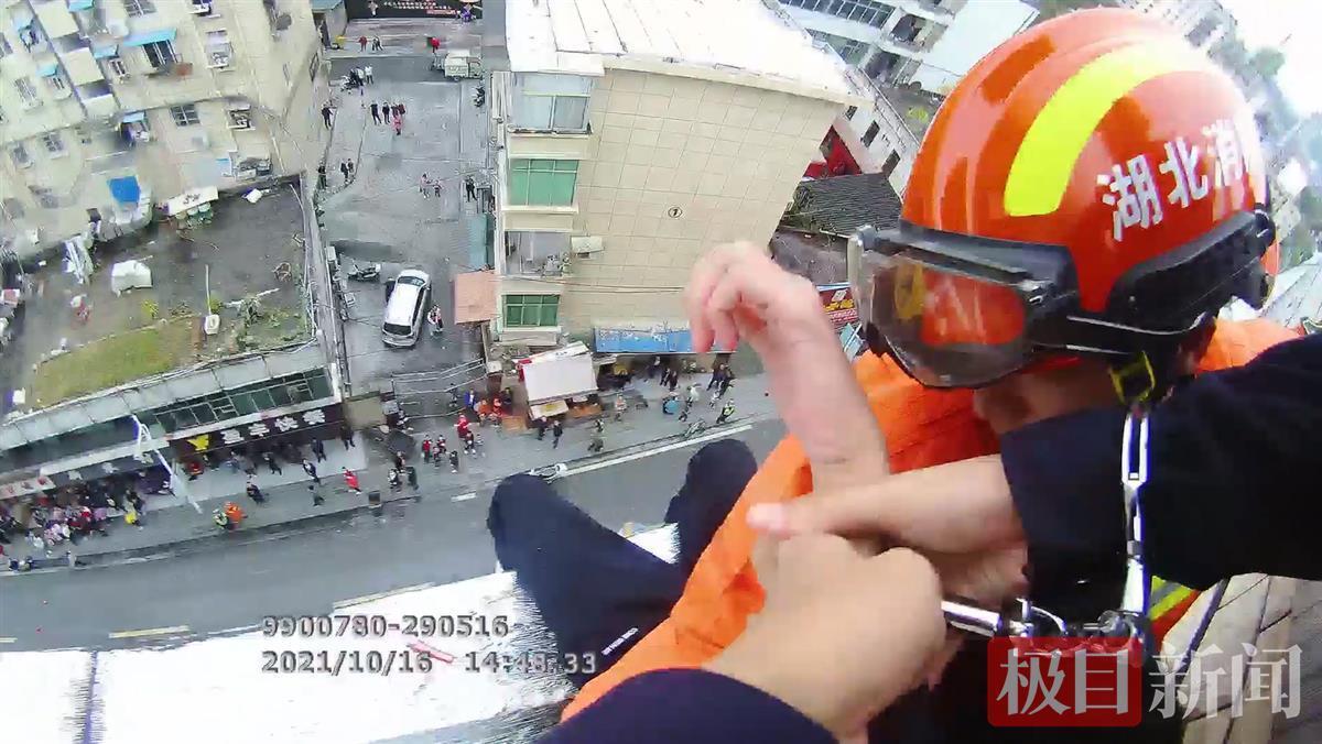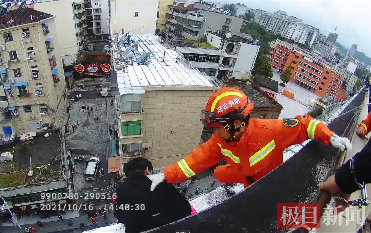 湖北十堰竹山县一男子因和家人发生争执后一时想不开,站在七楼楼顶欲轻生。民警和消防员决定给营救行动上一个“双保险”,在系好安全绳确保安全的前提下,民警事先将手铐的一端铐在自己手腕上,当消防员悄悄翻越围栏,迅速拉住当事人的右手臂对其进行控制营救时,民警和消防员合力将手铐另一端铐在当事人的手腕上,这样民警便和男子连在了一起,消除了其反抗或不慎坠落等安全隐患。